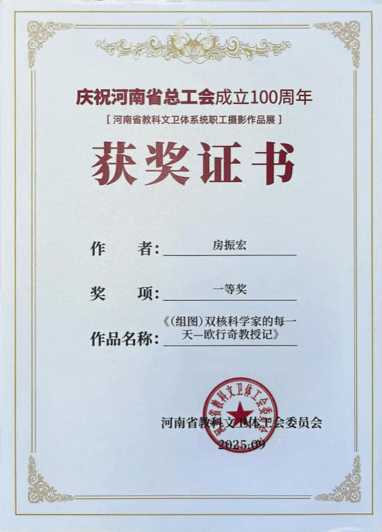 近日,从河南省教科文卫体工会委员会传来喜讯,在“百年工运路·光影映初心”——庆祝河南省总工会成立100周年职工摄影作品展中,我校教师房振宏的组照作品《(组图)双核科学家的每一天——欧行奇教授记》从241幅参赛作品中脱颖而出,荣获大赛一等奖。