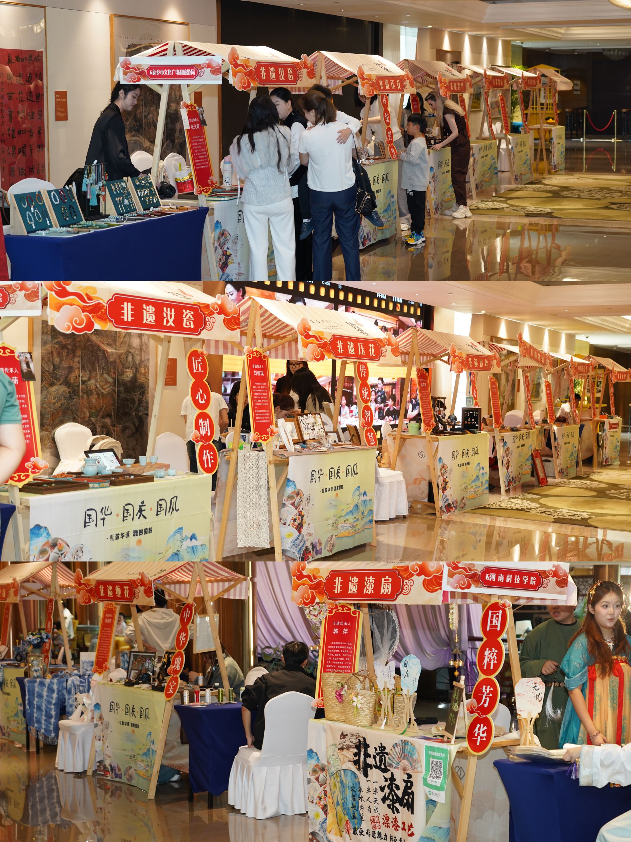 为庆祝中华人民共和国成立76周年,推动非物质文化遗产的创造性转化与创新性发展,10月2日至3日,我校分别在黄河迎宾馆与郑州索菲特国际饭店成功举办“非遗走进国宾馆”与“国庆·国华·国风”两场非遗主题市集活动。