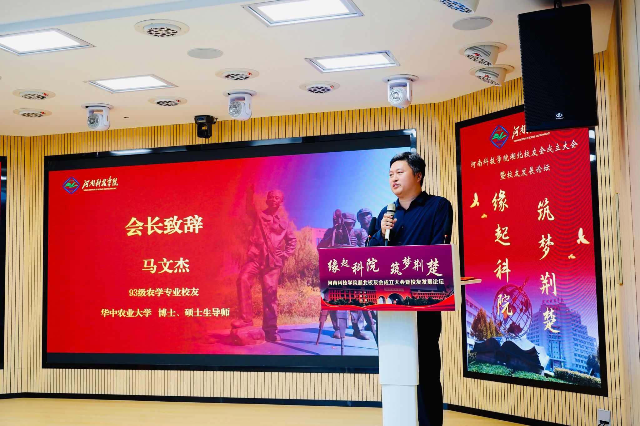 湖北校友会会长马文杰表态发言。他表示,将认真履行会长职责,不负学校和校友重托,秉承“联络感情、沟通信息、服务校友、创新发展”的目标,践行“崇德尚能、知行合一”的校训,共同建设有温度、有活力、有担当的校友之家,助力地方经济和母校事业高质量发展。