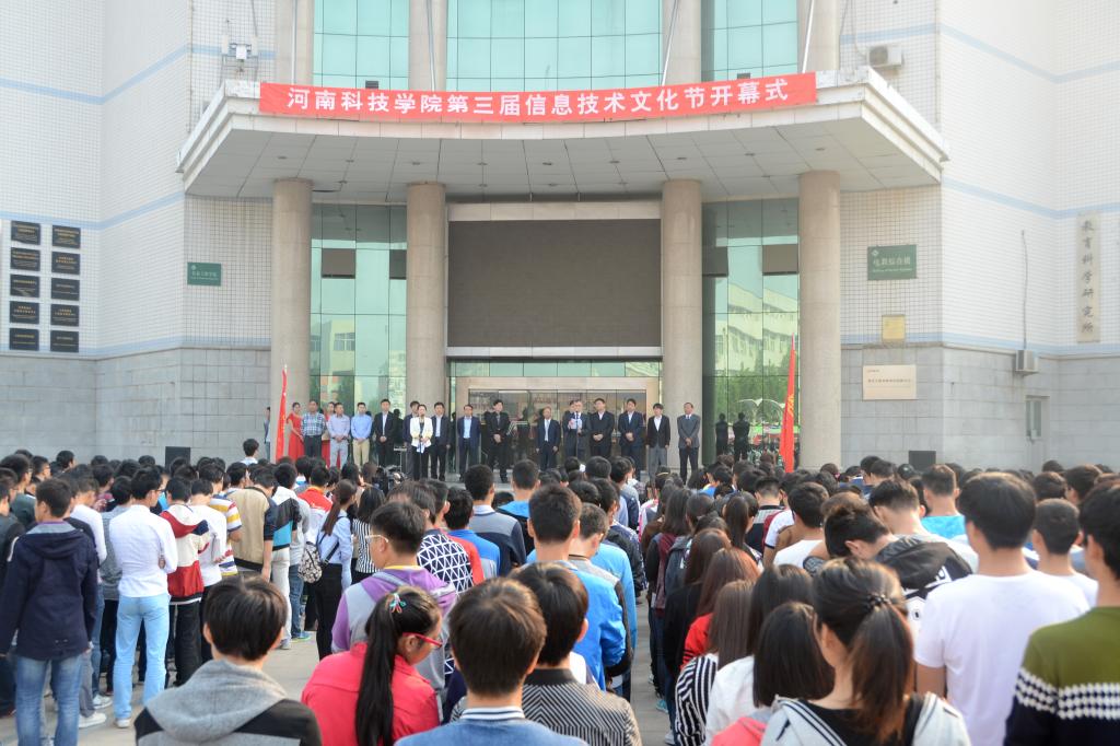 10月17日上午,第三届信息技术文化节开幕式在零号楼前举行。校党委副书记宋亚伟出席开幕式,党委宣传部、教务处、学生处、校团委、研究生处、招生就业处、网络信息中心、新科学院、信息工程学院等相关单位负责人和惠普(洛阳)软件人才产业基地、新乡市嘟嘟网络技术有限公司、新乡市朝歌电子信息科技园服务有限公司、沪江网河南基地和河南蓝海新能电动汽车公司等有关负责人及我校相关学院师生代表1500余名参加了开幕式。开幕式由教务处处长郭运瑞主持。