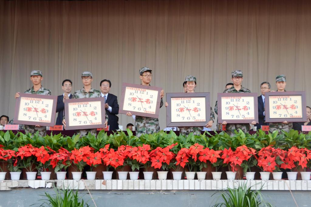 杨松璋宣布获奖名单。服装学院获得队列训练表演第一名,文法学院、新科学院获得队列训练表演第二名,食品学院、动物科学学院、园艺园林学院获得队列训练表演第三名;生命科技学院获得内务卫生先进单位、化学化工学院获得通讯报道先进单位、数学科学学院获得安全知识竞赛先进单位、体育学院获得征兵工作先进单位。