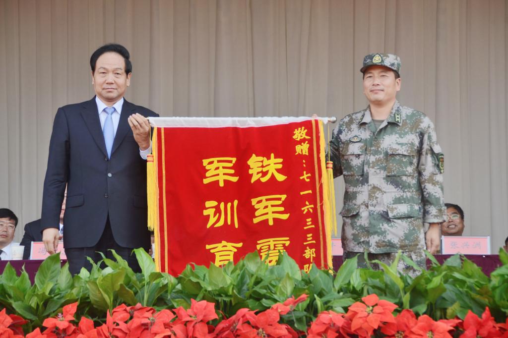 在热烈的掌声中,校党委书记牛书成向中国人民解放军71633部队赠送锦旗。
