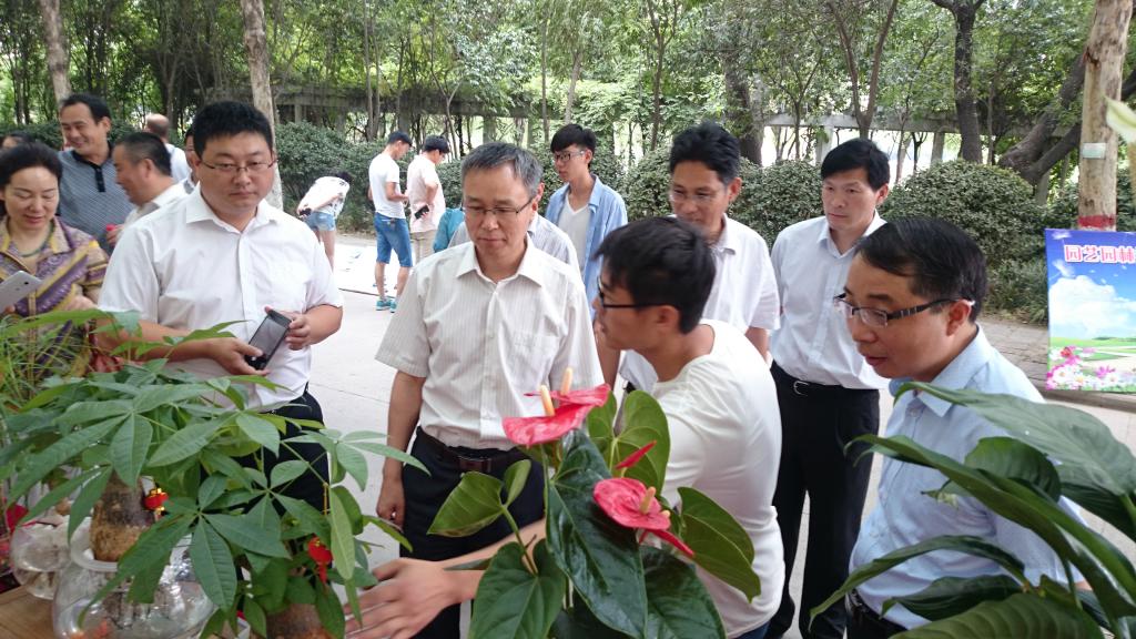 室内插花展演后,宋亚伟一行兴致勃勃地参观了室外摆放的水培、盆景及绘图作品。