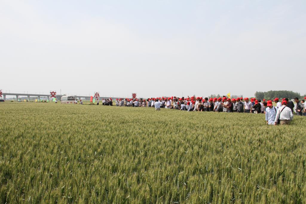 与会代表乘车前往新乡县李台、任村、朗公庙三处小麦基地,分别观摩了百农207、百农矮抗58以及茹振钢教授即将推出的新品种百农418、百农高光效、BNS杂交小麦。