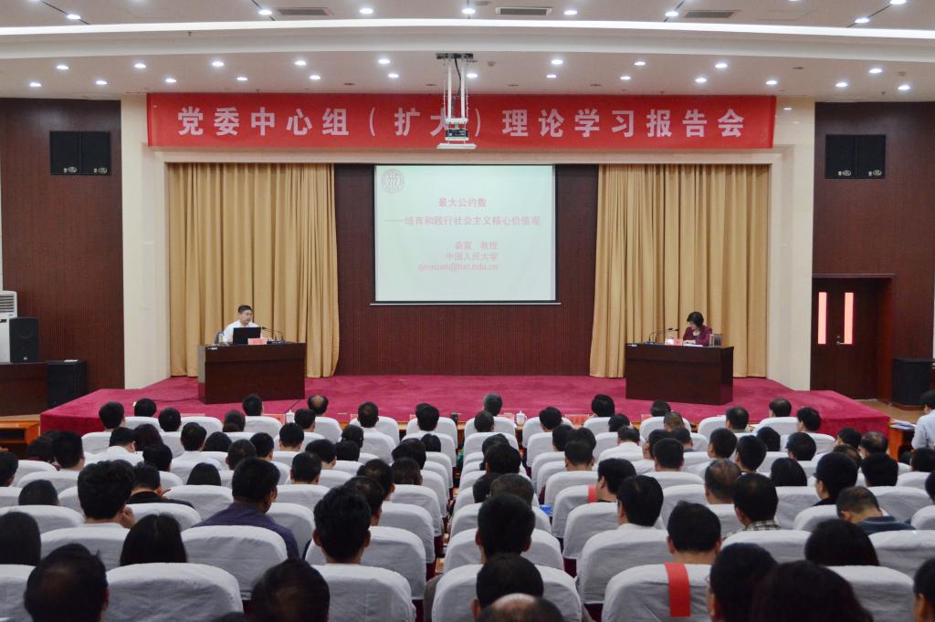 4月29日,校党委中心组理论学习报告会在办公楼三楼多功能报告厅举行。我国著名马克思主义理论家、中国人民大学《教学与研究》杂志社主编秦宣教授应邀作题为《最大公约数——培育和践行社会主义核心价值观》的专题报告。我校全体在校校领导、处级干部、教授、博士以及部分科级干部300余人参加了报告会。