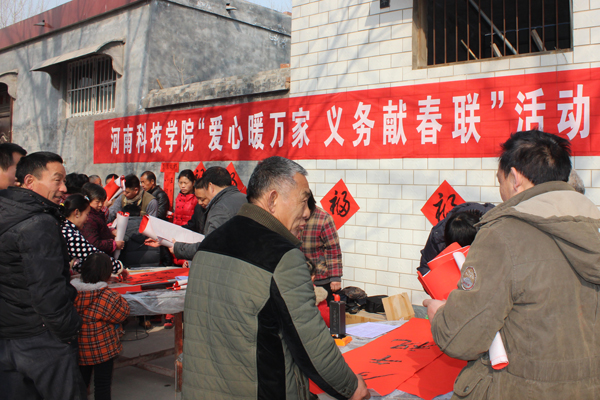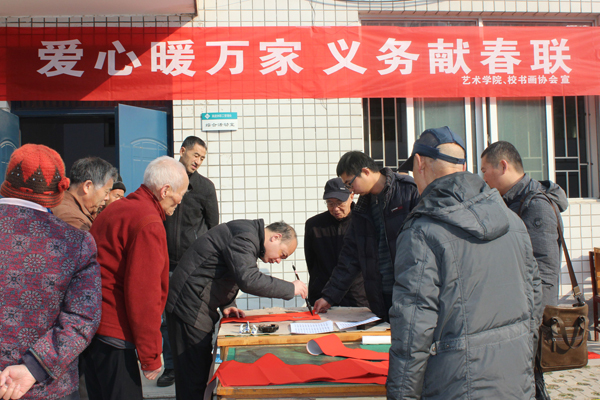 马岁荣光辉日月,羊毫遒劲续春秋。为充分发挥高校先进文化的辐射力,拓展高校服务社会渠道,丰富农村文化生活,2月12日,我校书画协会在校工会的大力支持下,来到新乡市原阳县五柳集村举行了“爱心暖万家、义务献春联”送文化下乡活动。