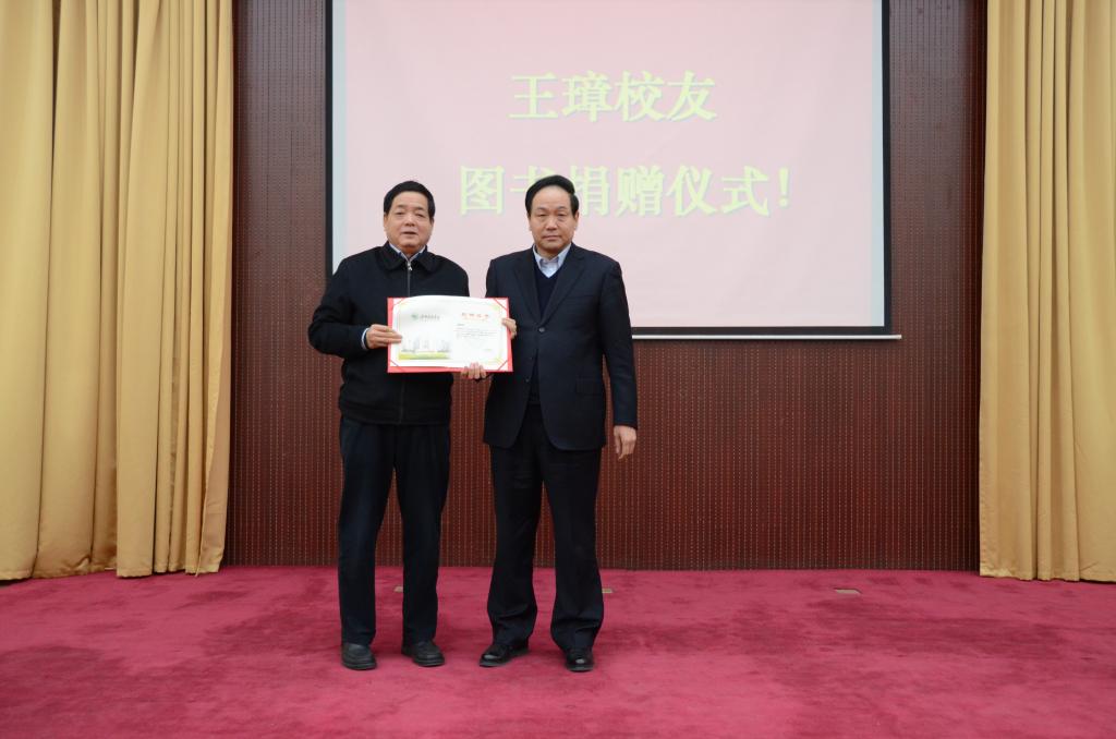 报告开始前举行了赠书仪式。王璋书记将自己多年创作的《跨越九曲十八弯——漫谈人生成功九定律》、《清风家话——漫谈干部子女家庭教育》、《坚持依靠群众推进工作落实——郑州市以网格为载体长效机制的实践与探索》、《钟声鸣响正当时——领导干部“四会一课”廉政教育探索与实践》、《权·钱·色——三权交易轨迹与防控探究》、《学做组织工作》和《“三票制”选“官”——干部选拔任用制度创新的实践与思考》七种共35册图书捐赠给母校,给广大师生带来了丰富的精神食粮。校党委书记牛书成向其颁发了捐赠证书。