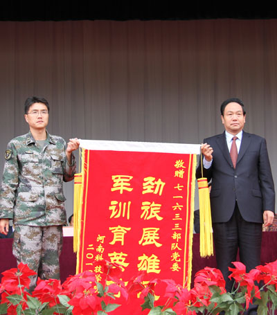 校党委书记牛书成、校长王清连和新乡军分区参谋长殷明全为71633部队军训教官颁发了荣誉证书。