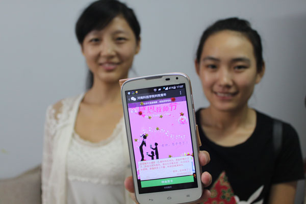 同学们还利用微博、微信、QQ等媒体向敬爱的老师送去节日的祝福。校团委“科院青年”微信平台上“低碳教师节”活动受到了同学们的追捧;信息工程学院的同学们在微博上发起了“教师节织微博、送祝福”活动;服装学院团委发起了“老师,我想对您说”教师节爱心网络接力活动,将对老师的祝福不断接力传递下去。