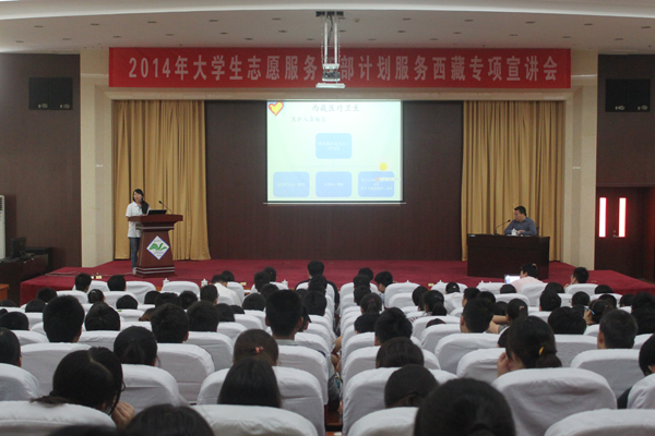 5月22日下午,全国西部计划西藏优秀志愿者巡回宣讲会在校办公楼308报告厅举行。校团委、学生处、招生就业处等单位的有关负责同志与300多名毕业生代表参加了报告会。