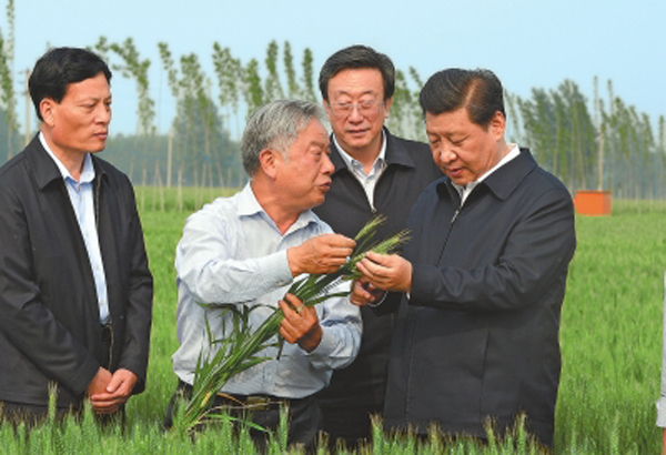 示范区内,连片的小麦绿浪滚滚、长势喜人。得知示范区种植的小麦品种是去年刚刚荣获国家科技进步一等奖的“矮抗58”,且亩穗数、穗粒数、千粒重等指标都很好,示范区可望增产几百万斤粮食时,习近平十分高兴。