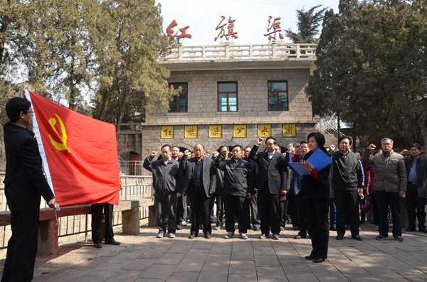 全体党员干部在红旗渠纪念馆前重温入党誓词