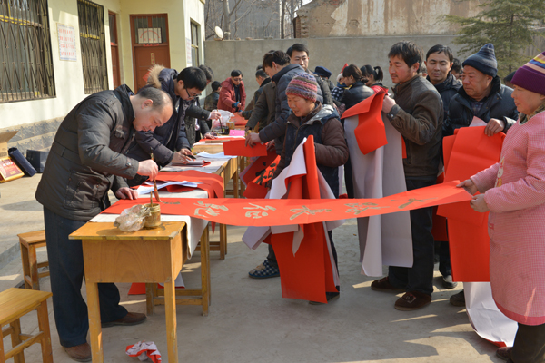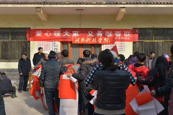 凯歌辞旧岁,骏马迎新春。为发挥高校先进文化的辐射力,丰富农村文化生活,促进新农村建设,在2014年新春佳节来临之际,1月25日,我校书画协会来到鹤壁市浚县西杨玘屯村举行了“爱心暖万家、义务献春联”送文化下乡活动。