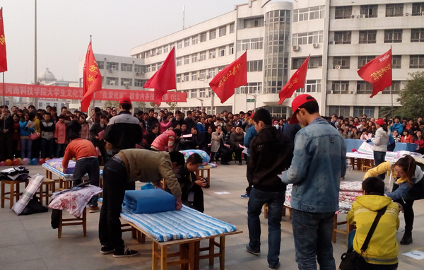 为了促进学生寝室文化建设,提高学生整理内务的水平,培养学生良好的生活、行为习惯,11月21日下午,由信息工程学院承办的大学生文化艺术月“我爱我家”宿舍内务技能大赛在致远广场举行。