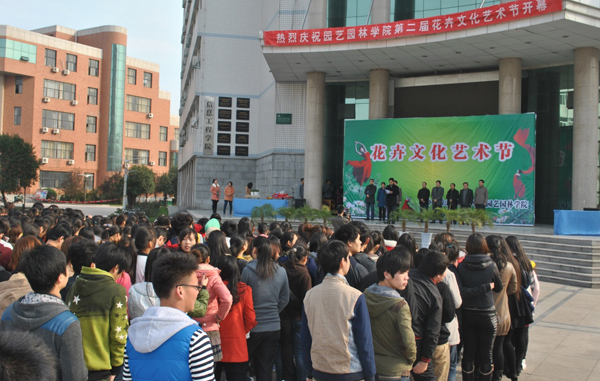 为进一步强化学生的专业素质,提高学生的艺术修养和人文素养, 11月10日上午,园艺园林学院在零号楼前举行了“第二届花卉文化艺术节”开幕式。校党委宣传部、党委学工部、校团委、教务处、招生就业处等相关职能部门负责人以及园艺园林学院党政领导,园艺园林学院300余名学生代表参加了开幕式。