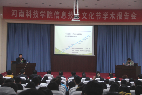 马新明教授以“农业信息化关键技术研究与应用”为题,结合自己的科研情况介绍了农业信息与农业信息化的概念,分析了国内外农业信息化发展战略和现状,讲解了农业信息化关键技术所包括的农业数据库与数据库系统、“3S”技术、模拟模型技术、物联网技术、信息传输系统及农业信息服务与电子商务技术、我省国家农村信息化示范省建设等情况。马教授的报告高屋建瓴,深入浅出,既注重理论性,又突出了现实性,使在座的师生受益匪浅。