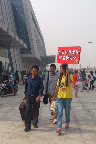 在学校致远广场,各学院的迎新接待人员高高举着写有学院名字的牌子,依次排开,方便新生们及时找到自己学院的接待处。当一辆辆满载着新生的校车稳稳停下之后,志愿者们便有序热情的带领、帮助学弟学妹们开始了相关入学手续的办理。