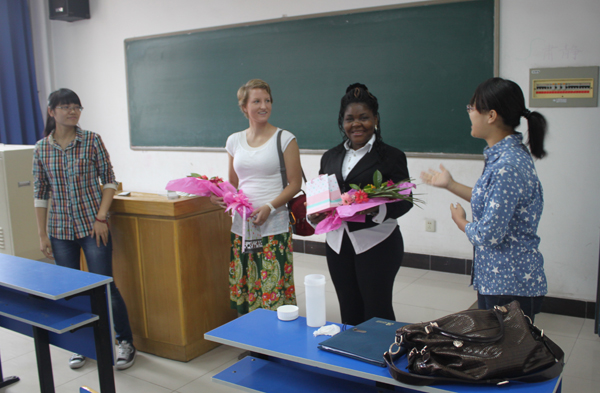 学生们为外教送上鲜花和礼物