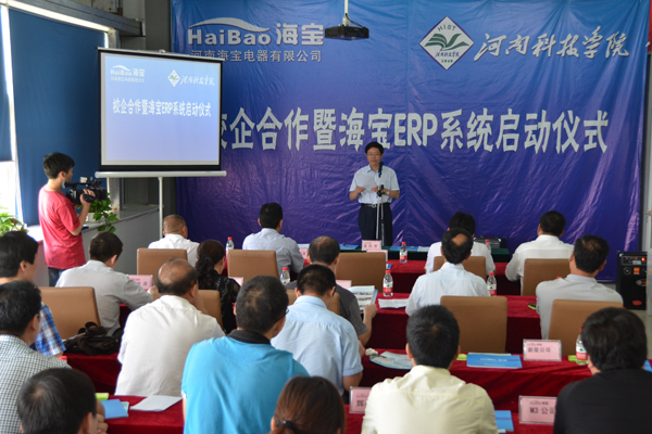 为适应社会和市场发展的需要,提高人才培养质量,加强学生理论学习与社会实践的有效结合,提升学生的综合竞争力,我校与河南海宝电器有限公司建立了长期校企合作关系。近日,双方合作暨ERP系统启动仪式在海宝电器有限公司会议室举行。我校副校长刘兴友、牧野区副区长刘剑锋、河南海宝电器有限公司总经理鲍树富等出席了启动仪式,我校教务处、科技处、信息工程学院等相关单位负责人及教师代表,河南海宝集团各部门负责人及河南青峰网络科技有限公司等8家友好单位的代表50余人参加了仪式。