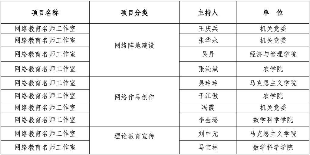 为推动我校网络思政工作创新发展,着力培育一批政治强、业务精、作风好的网络思政工作骨干,根据《河南科技学院关于申报网络教育名师工作室的通知》要求,党委宣传部组织开展了全校网络教育名师工作室申报评选工作。在各单位自愿申报的基础上,经资格审查、专家评审、综合评议,确定王庆兵等10人为学校网络教育名师工作室主持人。现将名单予以公布,并将有关事项通知如下: