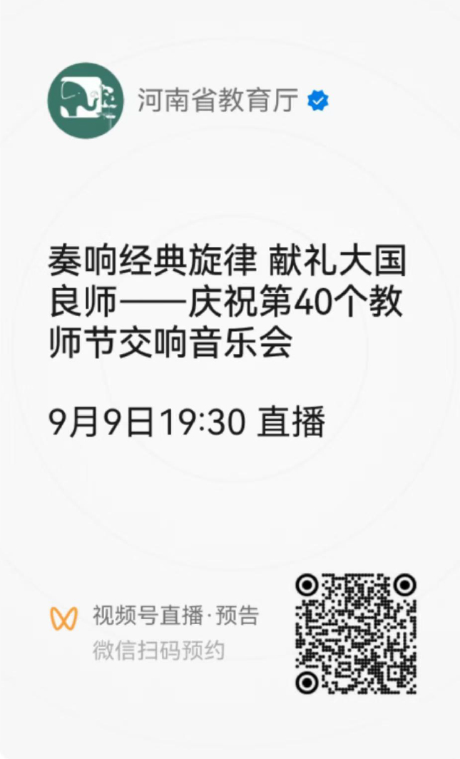 为深入贯彻党的二十大和党的二十届三中全会精神,大力弘扬教育家精神,全面展示新时代广大教师立德树人、自信自强的精神风貌,由中共河南省委教育工委、河南省教育厅主办,河南机电职业学院承办的“奏响经典旋律 献礼大国良师”庆祝第40个教师节交响音乐会将在河南艺术中心音乐厅举行。