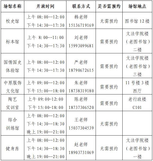 为丰富我校学生周末文化体育活动,学校校史馆、标本馆、国情国史体验馆、中原服饰文化馆、陶艺实训室、综合训练馆、健身房等场所将在周六、周日对学生开放。具体安排如下: