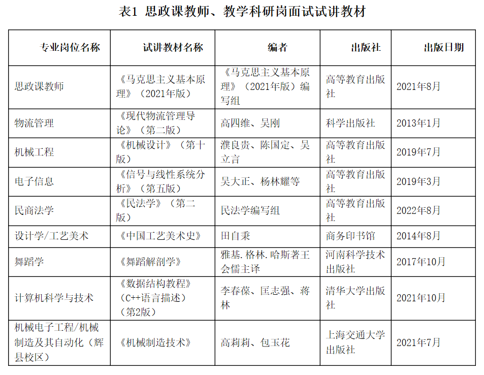 面试以试讲为主,辅之以答辩,满分100分。试讲主要考察应聘人员的形象气质、语言表达、教学内容、教学方法和技能、教学效果等;答辩主要考察应聘者的专业知识、逻辑思维能力、应变能力。试讲要求采用板书形式,不使用PPT。试讲章节由面试专家组在面试开始前商定,试讲教材见表1。