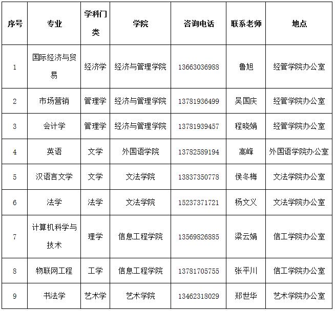 经河南省教育厅批准,我校目前开设的双学位教育专业共有九个:国际经济与贸易、市场营销、会计学、英语、汉语言文学、法学、计算机科学与技术、物联网工程、书法学。各学院有关信息见下表。