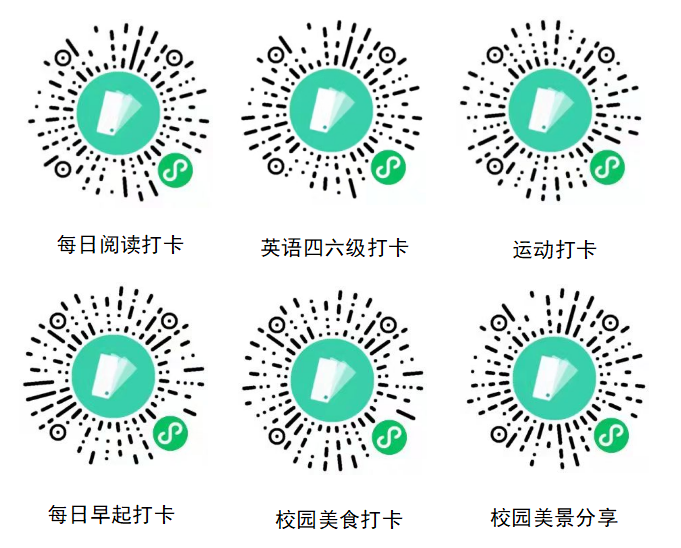 通过微信小程序“小打卡”,搜索找到“每日阅读打卡”“英语四六级打卡”“运动打卡”“每日早起打卡”“校园美食打卡”“校园美景分享”,并加入打卡圈子。根据打卡要求和内容,转发评论打卡推送,还可以点赞、评论、互动。