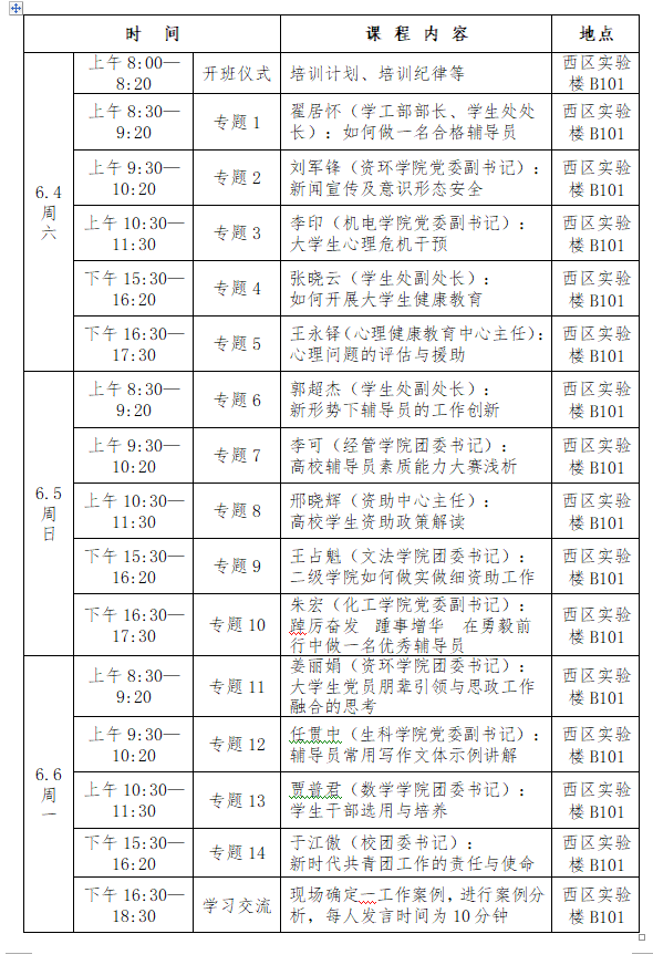 1.各学院要高度重视新入职辅导员培训工作,严格按照培训日程安排组织所属学院辅导员按时参加培训。
