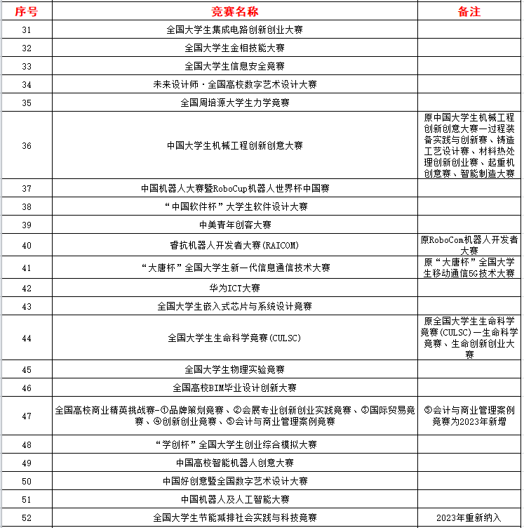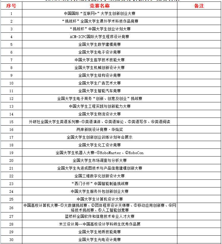 为进一步加强我校学风建设,激发广大学生参加各类竞赛活动的积极性和主动性,努力营造比学赶超、奋勇争先的学习氛围,现将《2023年全国普通高校大学生竞赛分析报告》竞赛目录发给大家:
