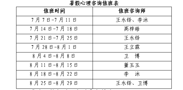 暑假期间,心理健康教育与指导中心将继续为在校学生提供心理咨询服务。咨询以电话、邮箱等方式开展,具体安排如下: