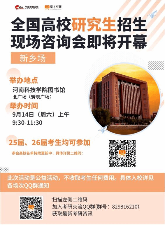 为了帮助广大考生更好地了解高校研究生招生的相关政策等资讯,中国教育在线将在9月14日在河南科技学院举办“2025年全国高校研究生招生现场咨询会”。此次活动旨在搭建起学校与考生之间的交流平台,让老师与考生更便捷、更高效地面对面沟通与解惑,从而帮助考生能够全方位地了解考研信息,协助高校精准锁定考研人群!鼓励在校生积极参加咨询会。