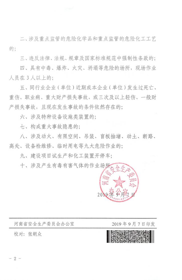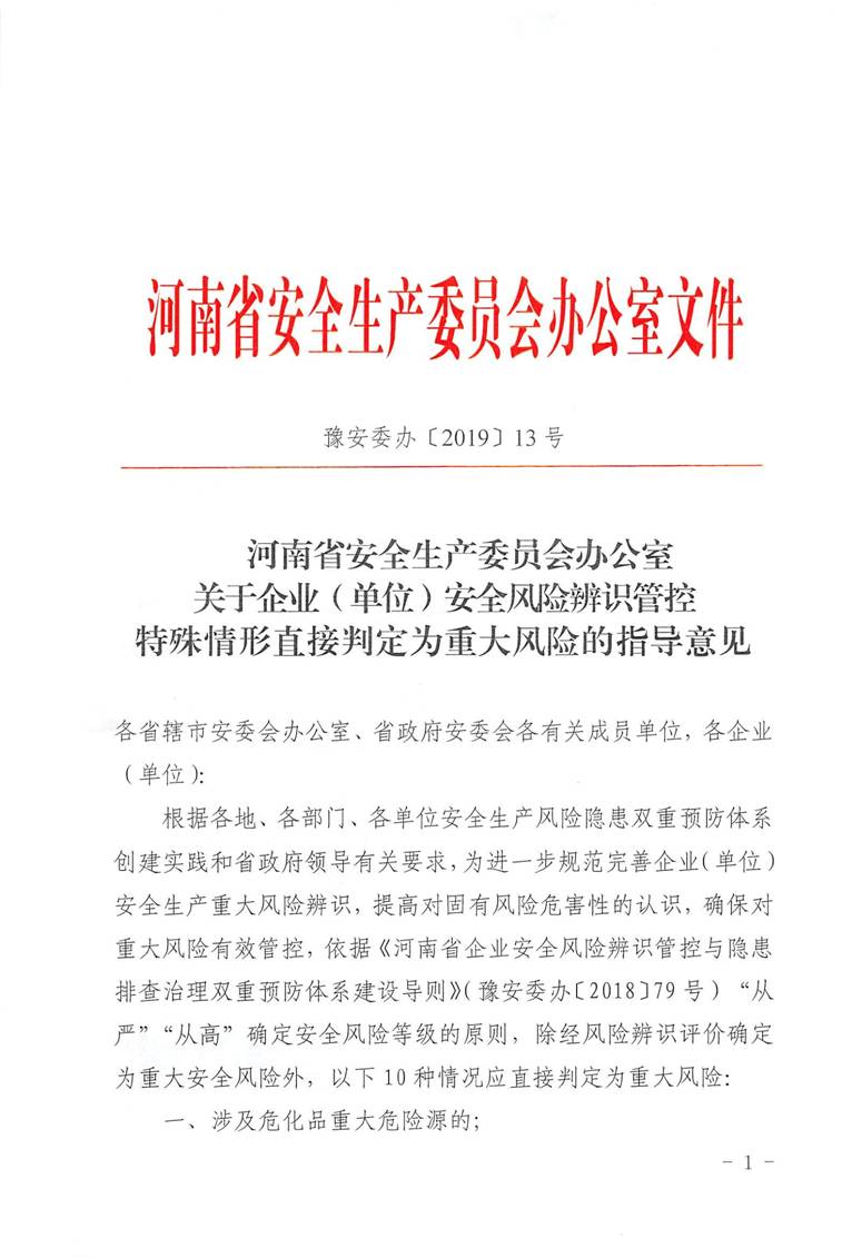 现将《河南省安全生产委员会办公室企业(单位)安全风险辨识管控特殊情形直接判定为重大风险的指导意见》转发给你们,请各单位在认真学习《河南省企业安全风险辨识管控与隐患排查治理双重预防体系建设导则》的基础上,依据《意见》精神,切实提高对固有风险危害性的认识,确保对重大风险做到有效管控。