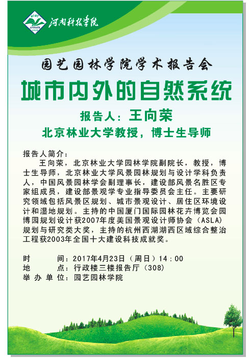 王向荣,北京林业大学园林学院副院长,教授,博士生导师,北京林业大学风景园林规划与设计学科负责人,中国风景园林学会副理事长,建设部风景名胜区专家组成员,建设部景观学专业指导委员会主任。主要研究领域包括风景区规划、城市景观设计、居住区环境设计和湿地规划。主持的中国厦门国际园林花卉博览会园博园规划设计获2007年度美国景观设计师协会(ASLA)规划与研究类大奖,主持的杭州西湖湖西区域综合整治工程获2003年全国十大建设科技成就奖。