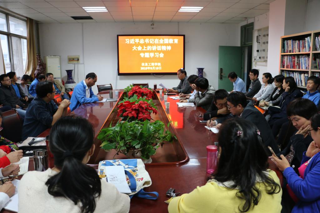 2018年9月19日下午,信息工程学院在0#502召开学习习近平总书记在全国教育大会上的讲话精神专题会。党委书记郎瑞红、院长李国厚、党委副书记张建设、副院长余周、副院长古乐声及教师50余人参加了本次专题会。