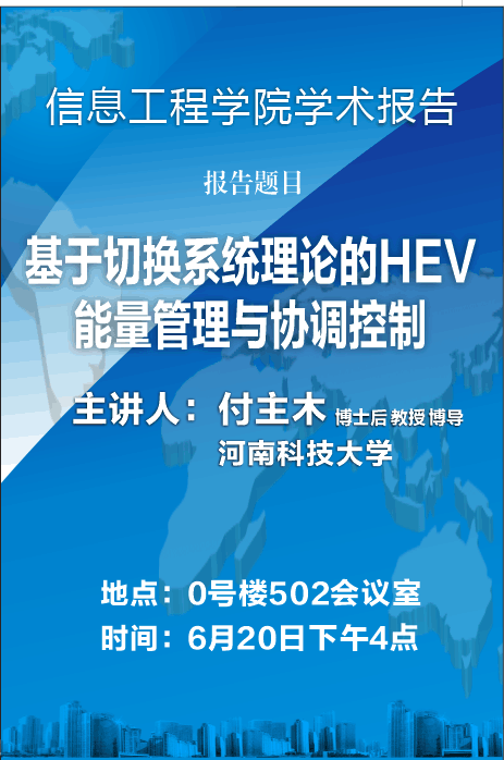 报告人:付主木,博士后,现任河南科技大学息工程学院副院长、教授、控制科学与工程学科博士生导师。兼任河南省机器人与智能系统重点实验室常务副主任、中国自动化学会高级会员、中国自动化学会第一届车辆控制与智能化专业委员会委员、河南省自动化学会常务理事。主要从事切换系统理论及其在混合动力汽车能量管理中的应用等跨学科交叉科学研究。