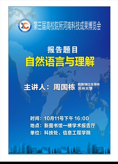 报告人简介: 周国栋,教授(二级), 博导,苏州大学自然语言处理实验室主任。1997年12月毕业于新加坡国立大学获得博士学位;1998年1月至1999年3月在新加坡国立大学从事博士后研究;1999年4月-2006年8月在新加坡资讯通信研究院分别担任副研究员、研究员和副主任研究员;2006年8月底加入苏州大学担任教授博导,组建自然语言处理实验室。研究方向:自然语言理解、自然语言认知等。近5年来发表国际著名SCI期刊论文30多篇和国际顶级会议ACL/ EMNLP/ COLING/ IJCAI/ AAAI论文80多篇,主持国家自然科学基金项目项目4项(包括重点项目2项) 。据Google Scholar统计,论文引用超过9000次。曾担任国际自然语言理解领域顶级SCI期刊Computational Linguistics编委。目前担任ACM TALLIP副主编、《软件学报》责任编委、中国计算机学会自然语言处理专委会主任、中国计算机学会理事、中国人工智能学会自然语言理解专委会副主任、中国人工智能学会常务理事、中国中文信息学会理事、中国语文现代化学会语言现代化与智能化研究会副理事长。