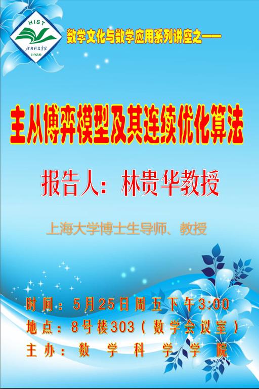 报告人简介:林贵华教授于2004年博士毕业于日本京都大学,曾任京都大学JSPS外国人特别研究员,现任上海大学管理学院教授、管理科学与工程系主任、运筹优化与决策研究所长。研究兴趣主要是与均衡相关的各种最优化问题及其在管理科学中的应用,在SIAM Journal on Optimization、Mathematical Programming、Mathematics of Computation、European Journal of Operational Research等国际知名期刊上发表学术论文60余篇。主持国家自然科学基金项目4项、省部级项目5项。现任中国运筹学会理事、中国运筹学会数学规划分会理事、上海运筹学会理事、中国双法研究会经济数学与管理数学分会常务理事等,《Pacific Journal of Optimization》(SCI期刊)、《运筹与管理》(管理学部A类期刊)等杂志编委。