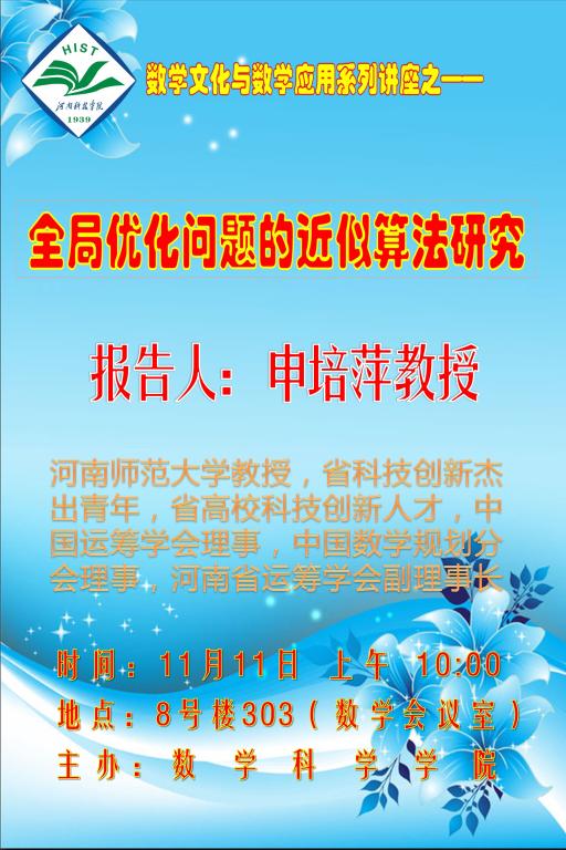 报告人简介:申培萍,女,1964年10月生,河南师范大学教授,博士,河南省高校青年骨干教师,河南省教育厅学术技术带头人,河南省科技创新杰出青年,河南省高校科技创新人才,中国运筹学会理事,中国数学规划分会理事,河南省运筹学会副理事长。主持国家自然科学基金面上项目3项,在Journal of Global Optimization、Optimization、Mathematical Methods of Operations Research等国际知名优化类学术期刊上发表论文50余篇。