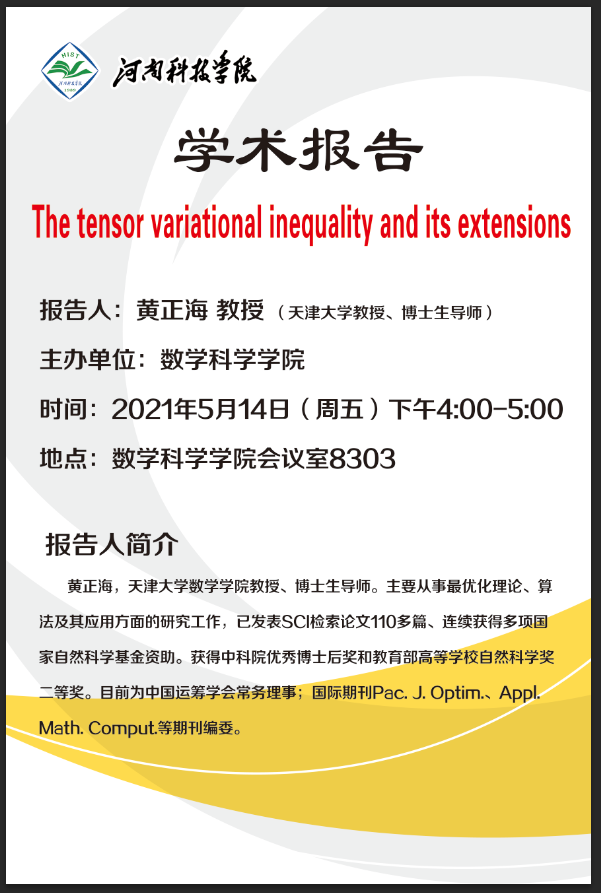 报告人简介:黄正海,天津大学数学学院教授、博士生导师。主要从事最优化理论、算法及其应用方面的研究工作,已发表SCI检索论文110多篇、连续获得多项国家自然科学基金资助。获得中科院优秀博士后奖和教育部高等学校自然科学奖二等奖。目前为中国运筹学会常务理事;国际期刊Pac. J. Optim.、Appl. Math. Comput.等期刊编委。