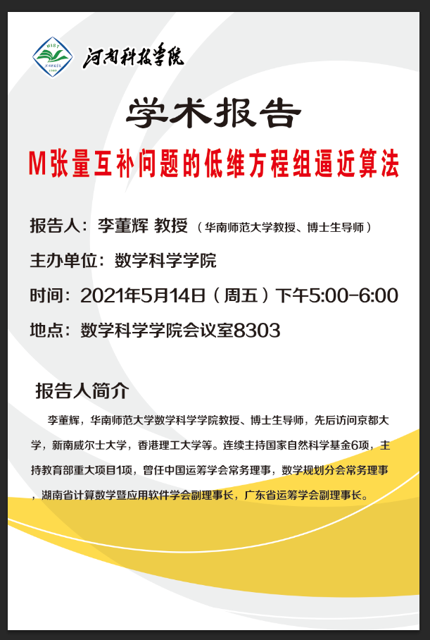 报告人简介:李董辉,华南师范大学数学科学学院教授、博士生导师,先后访问京都大学,新南威尔士大学,香港理工大学等。连续主持国家自然科学基金6项,主持教育部重大项目1项,曾任中国运筹学会常务理事,数学规划分会常务理事,湖南省计算数学暨应用软件学会副理事长,广东省运筹学会副理事长。