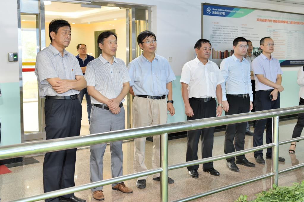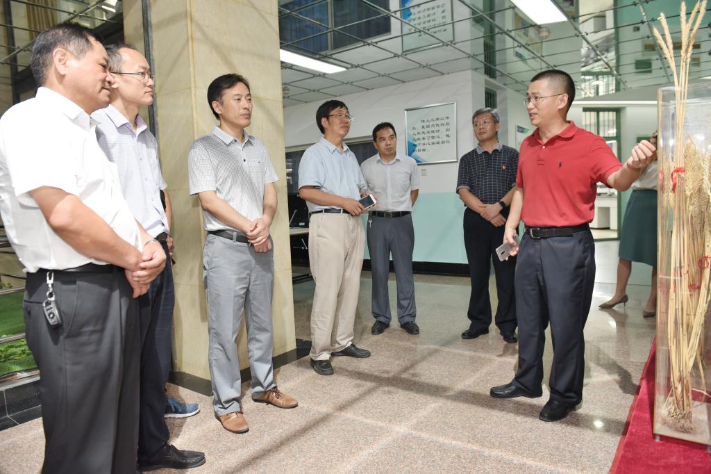 在综合实验楼,王现全一行观看了我校科技工作宣传片,参观了组织培养室、分子检测室、人工气候室等实验室,听取了河南省杂交小麦工程技术中心主任胡铁柱对我校培育的各个时期小麦品种特点及“百农4199”香麦面粉性状的详细介绍。李成伟向王现全一行介绍了我校在基因组编辑技术方面的突破和创新,及该技术在加快推进小麦育种进程中的作用。