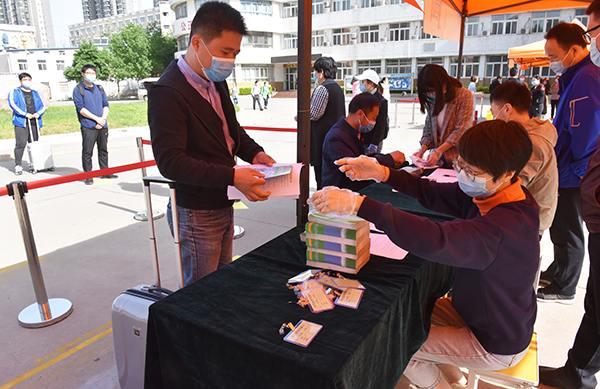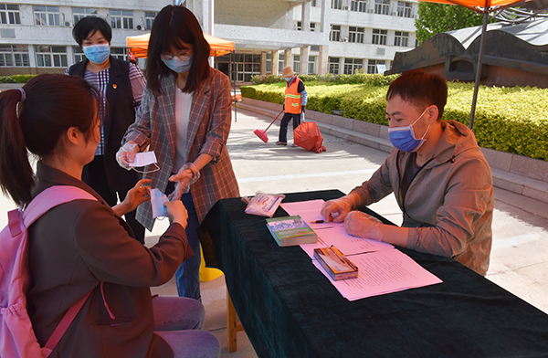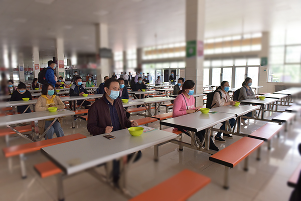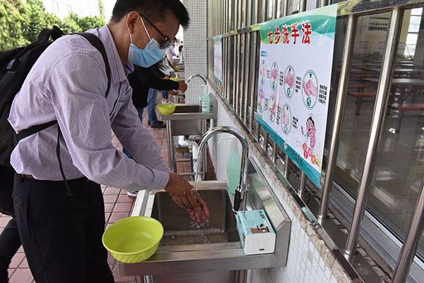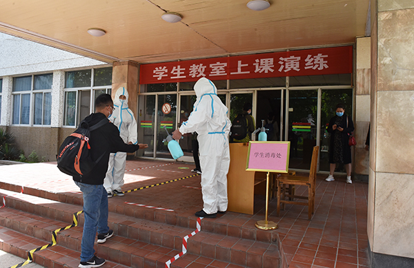 在致远广场学生报到接待点,学生们在间隔距离范围内等待完成入校手续办理,工作人员发放疫情防控常识小册子、指导学生办理手续;第一教学楼前,学生们有序排队进行消毒、体温检测。进入教室后一人一桌就坐,避免近距离接触,教师核对学生人数后开始上课;学生第一食堂前设置洗手区,学生们按照七步洗手法,洗手后自带餐具,有序排队进入食堂,一人一桌就餐;学生公寓前,学生排队消毒、测温、扫码、出示相关证件,确认为该宿舍楼人员后进入宿舍;学校相关单位工作人员按预定操作流程演练,每个环节都展示了可能出现特殊情况的应急处置方法。