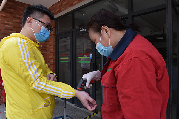 作为疫情防控的第一防线,学校大门口设置了醒目的隔离带、指示标识、测温通道、体温异常学生隔离观察区。学生佩戴口罩、间隔一米,在工作人员的引导下,经过严格的消毒、更换学校免费提供的新口罩、测量体温,通过测温通道等程序,体温正常后方可有序进入校园。