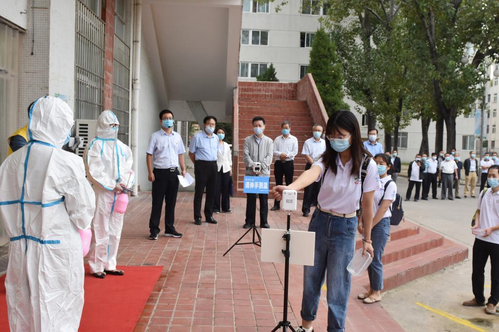 随后,学生排队进入一号楼合一教室参与课堂教学。任课教师主动到值班室进行消毒、接受测温,教室严格消杀和通风,学生全程佩戴口罩,间隔就座。