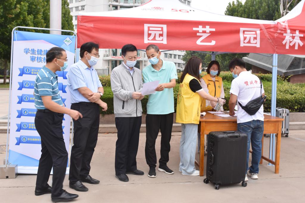 在学生返校报到演练现场,学生进门前进行卫生消杀,通过测温通道进行体温检测、身份验证后,进入校园到所在学院报到点进行健康信息核验并签订承诺书,完成入校报到手续办理。