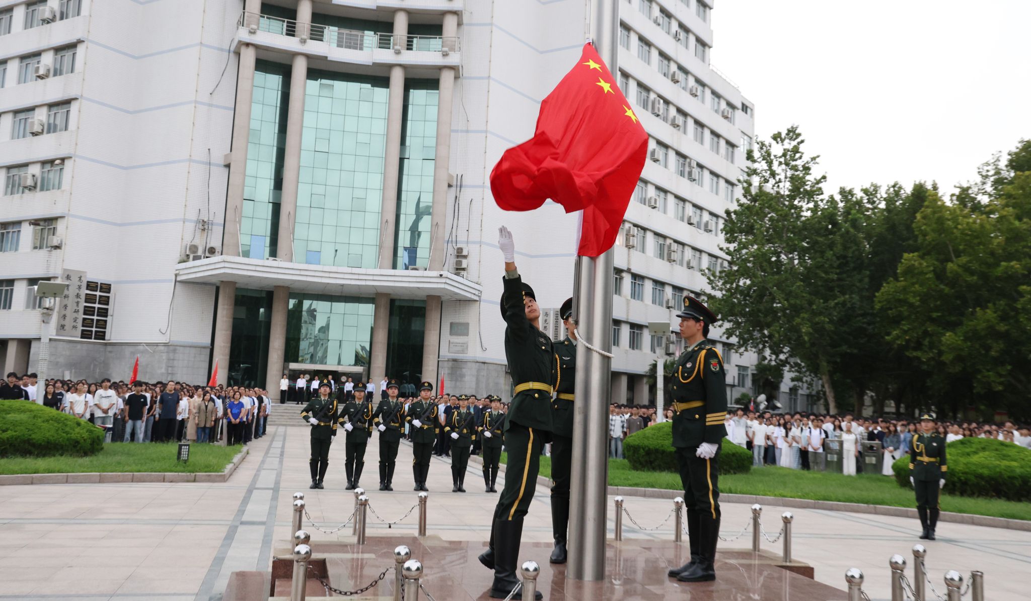 9月8日上午,我校在致远广场举行新学期升国旗仪式。校领导宋亚伟、王庆兵、刘全永、胡铁柱、王洪亮、马金友、王莉华、乐玉忠以及全校中层干部、教师代表、学生代表共5000余人参加了升旗仪式。