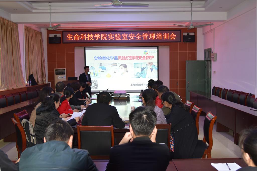 为了落实省教育厅和学校实验室安全检查的相关通知精神,提高我院实验人员的安全管理意识。4月22日上午,我院邀请上海研纷生化科技有限公司屈文军工程师在会议室E110进行了“实验室化学品风险识别和安全防护”的安全培训。我院中心实验室主任、全体实验室主任和实验员、教师及学生代表参加了此次培训会,培训会由生命科技学院副院长杨天佑主持。