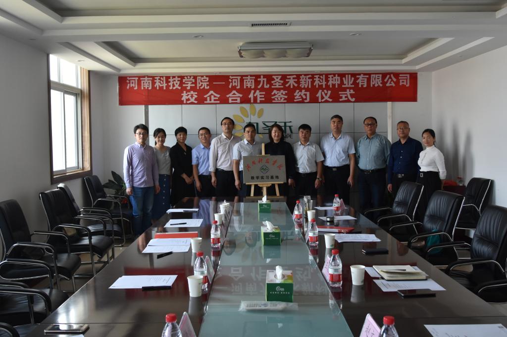 9月26日,我院与河南九圣禾新科种业有限公司战略合作及教学实践基地签约仪式在河南九圣禾新科种业有限公司举行。河南九圣禾新科种业有限公司董事长王文玉、总经理孙志军、副总经理赵文奇、我校教务处副处长赵新亮、生命科技学院院长刘明久、小麦中心主任胡铁柱、副院长胡海燕及办公室人员出席签约仪式。